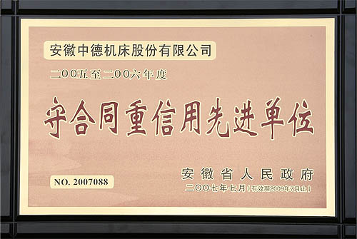 近日,安徽中德機(jī)床股份有限公司被安徽省人民政府授予2005-2006年度“守合同重信用先進(jìn)單位”這一稱號(hào)。這也是我公司繼由馬鞍山市工商局、市人民政府、省工商局多次授予此類稱號(hào)后,再次獲得的更高級(jí)別的榮譽(yù)。