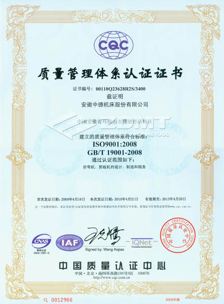 2010年4月,我公司順利通過了ISO 9001:2008版換證復(fù)審,獲得認(rèn)證證書(證書編號(hào):00110Q23628R2S/3400)。在此次復(fù)審過程中,中國質(zhì)量認(rèn)證中心(CQC)對我公司的質(zhì)量體系運(yùn)行情況進(jìn)行了全方位嚴(yán)格審核,并對中德公司質(zhì)量管理工作給予了充分的肯定。